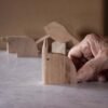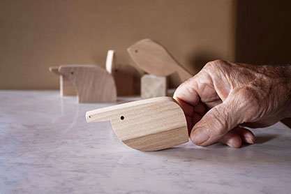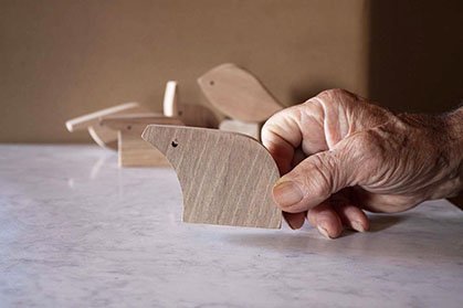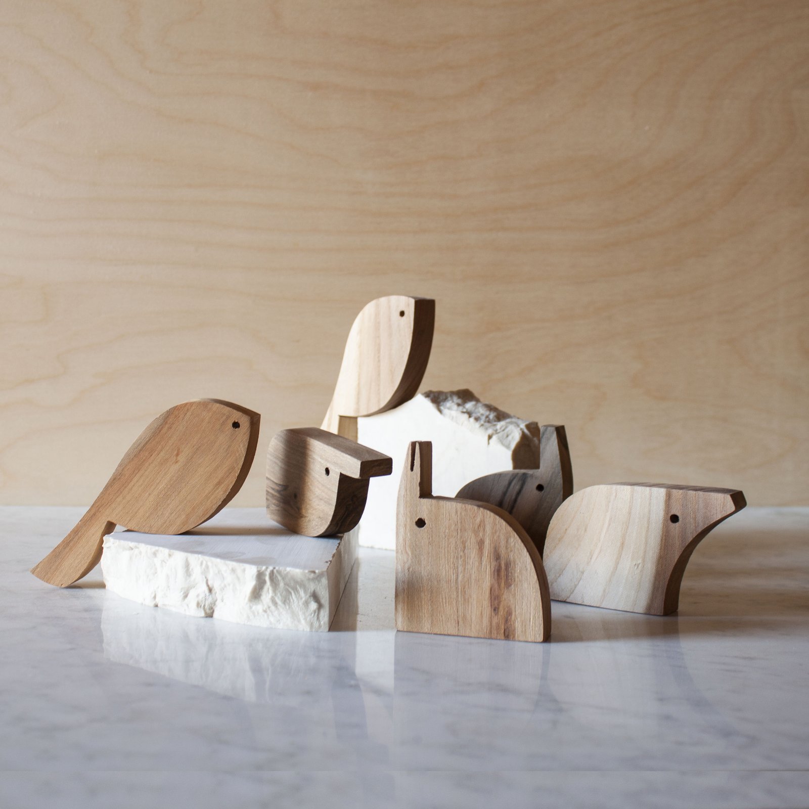 Forme di animali stilizzati realizzati in vari tipi di legno.
